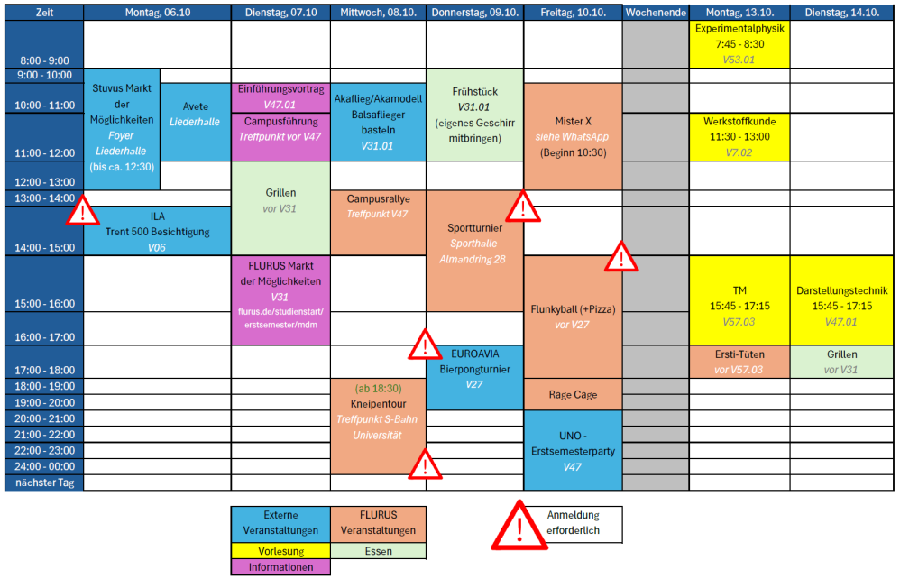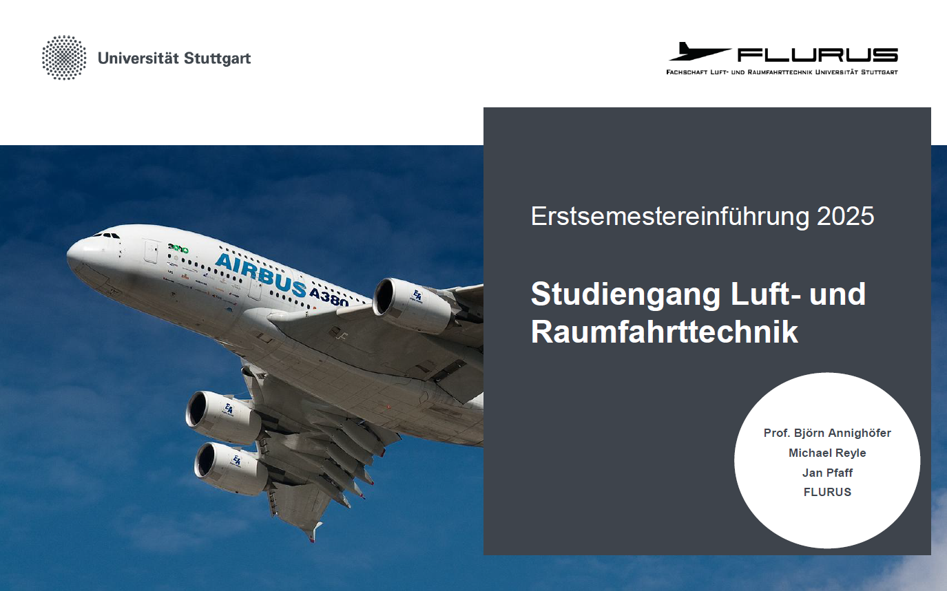 Die Erstsemestereinführung findet vom 06. bis 10.10.2025 statt. Plant bitte so, dass ihr zu dieser Zeit schon in Stuttgart seid. Alle allgemeinen Infos rund um die ESE findet ihr hier: stuvus.de/ese. Den genauen Ablaufplan der Erstsemestereinführung für Luft- und Raumfahrttechniker findet ihr hier.