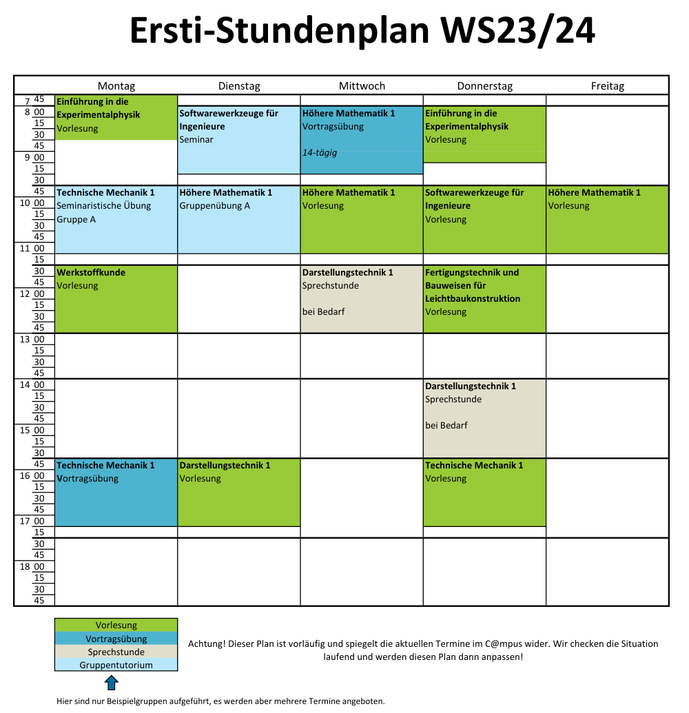 Bereits vor der Erstsemestereinführung findet das Erstsemesterwochenende (EWOK) vom 02. bis zum 04. Oktober 2025 statt. Zur Vorbereitung auf das Studium empfehlen wir außerdem die Vorkurse des MINT-Kollegs zu besuchen, besonders im Bereich Mathematik. Der Mathe-Vorkurs findet 2025 vom 22. September bis 2. Oktober statt. Für den Vorkurs müsst ihr euch beim MINT-Kolleg kostenpflichtig anmelden.